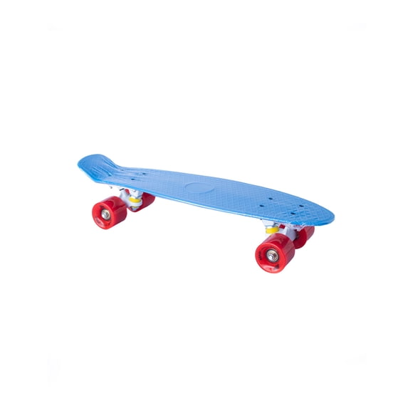Patineta semiprofesional minicruiser tipo penny con deck azul, trucks blancos y ruedas rojas Display Penny minicruiser