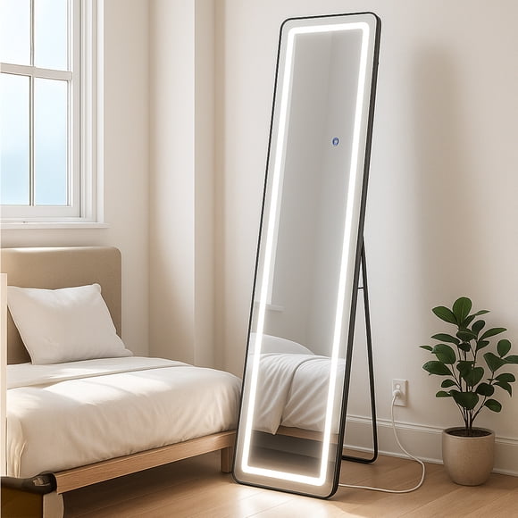 Espejo de Piso Cuerpo Completo con Luz Led de 3 Tonos Soporte y Marco Diseño Minimalista - Espejo de Pie y Pared para Dormitorio Recamara Sala Baño e Interiores 143 cm