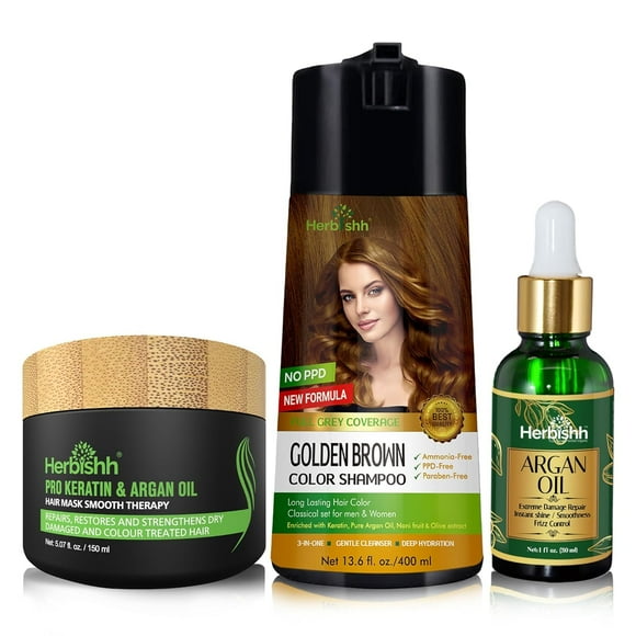 Herbishh Hair Color Shampoo for Gray Hair - PPD-Free Hair Dye Shampoo and Conditioner + Argan Oil 30mL Hydrating Hair Oil + Pro Keratin Argan Oil Hair Mask for Dry, Damaged Hair 150mL (Golden Brown)Available for Envío internacionalEnvío internacional