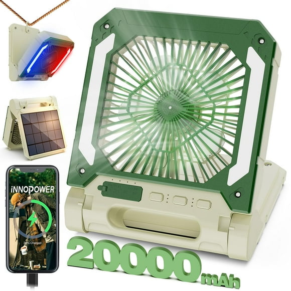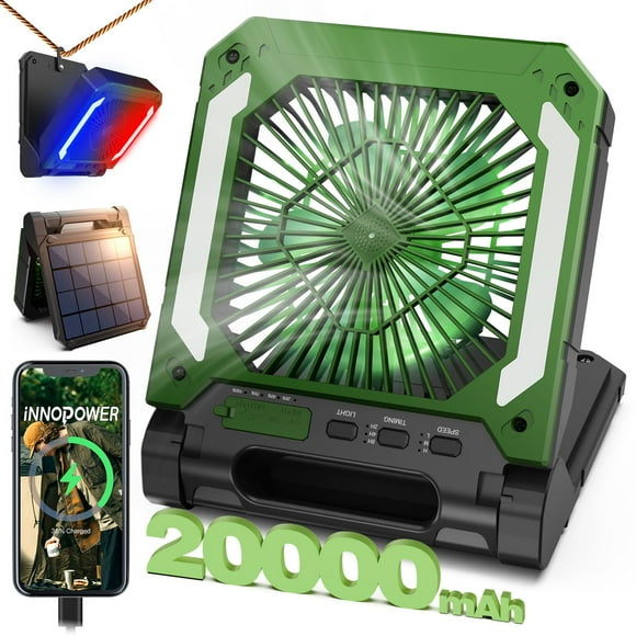 Ventilador con energía solar de 20000 mAh, ventilador recargable, ventilador con batería, ventilador portátil con 3 fuertes vientos y banco de energía, ventilador para persona para acampar al aire libVentilador portátil Innopower 20000mAh recargable con energía solar