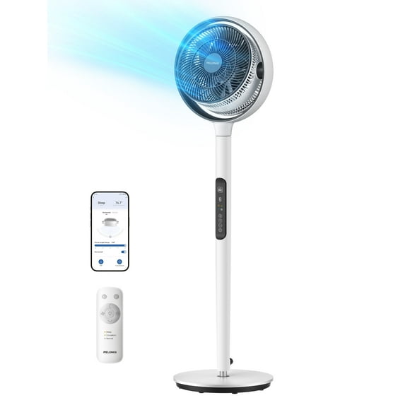 PELONIS Ventilador de pie con pedestal oscilante de 16" | Altura ajustable | Motor CC ultra silencioso | Control remoto | 12 velocidades | Temporizador de 12 horas | Alta eficiencia energética