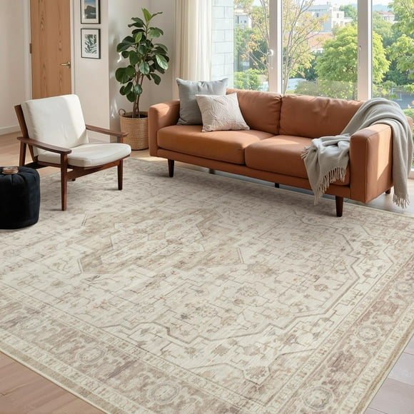 Alfombra Area Rugxara, lavable, 160 x 200 cm, vintage, color crema neutro