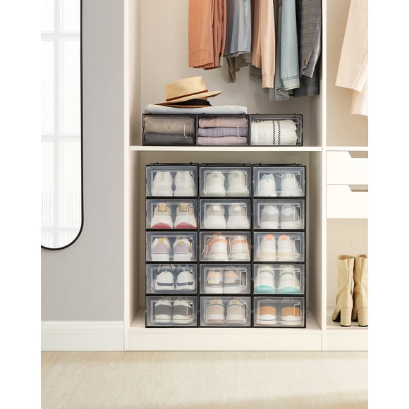 SONGMICS Cajas de Zapatos Plástico, Juego de 18 Organizadores de Almacenamiento, Caja Zapatero Plástico Plegable y Apilable para Zapatillas hasta talla 44, Transparente y NegroSONGMICS Sombrilla para Patio, Sombrilla de Mesa de Exterior de 2,75m, con 8 costillas, UPF 50+, Inclinación Doble de 30°, Base no Incluida, para Patio, Jardín, Piscina, Azul Lago