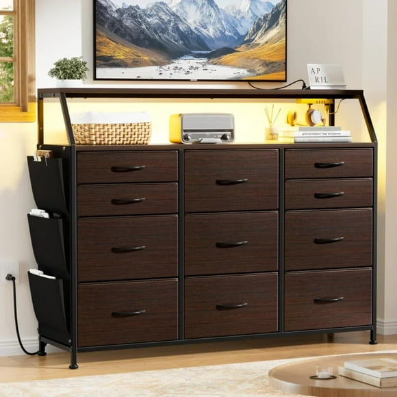 Comoda Cajonera para Recamara -11 Cajones De Tela con Parte Superior de Madera y Marco De Acero Plegable - Mueble Organizador con cajonera para Ropa - Luces LED - Estación de Carga.