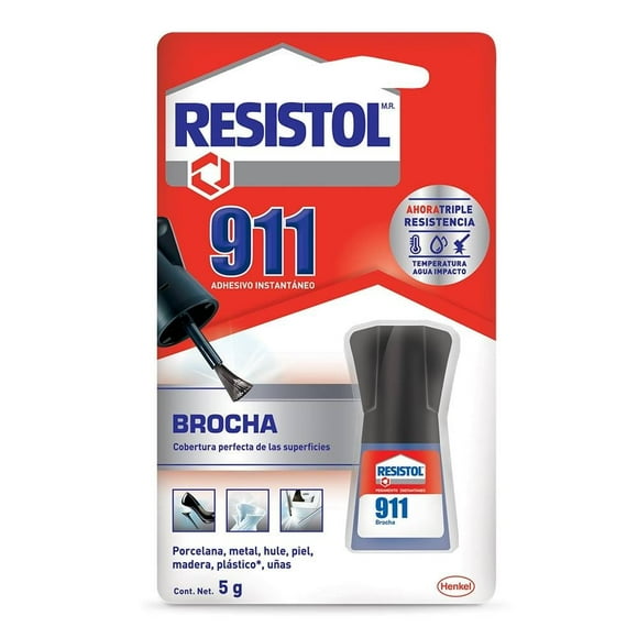 Adhesivo instantáneo Resistol 911 brocha 5 gPegamento multiusos resistente para bandas laterales. Adhesivo suave multifuncional para unir metal, vidrio, cerámica, ladrillo, plástico, madera, cuero y zapatos.