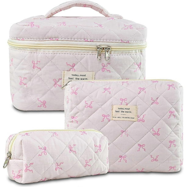 Quilted Makeup Bag, Cute Floral Cotton Cosmetic Bag set, Coquette Bow Makeup Pouch Large Travel Toiletry Bag