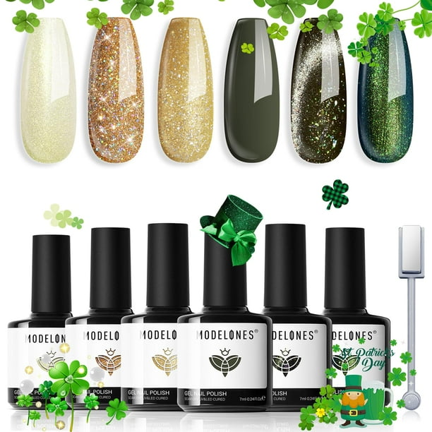 Set de esmaltes de uñas en gel Modelones, 6 colores con imán, diseño de San Patricio
