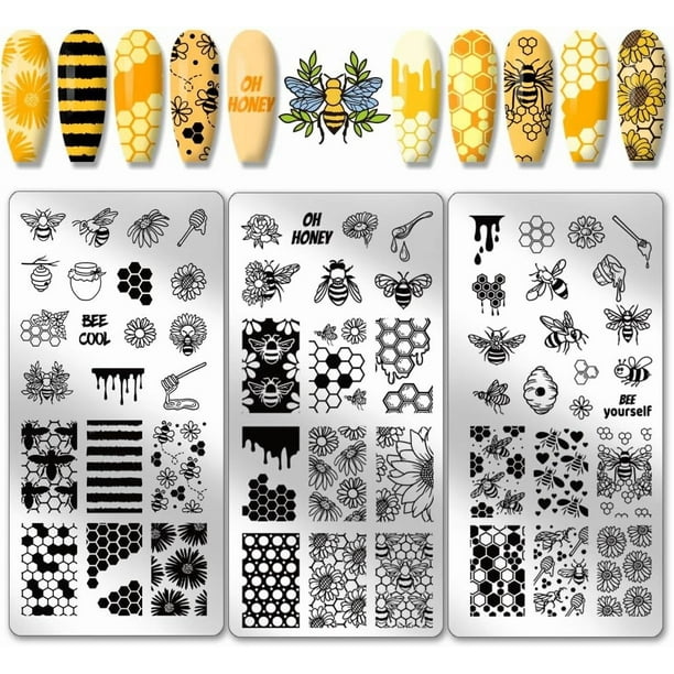 Juego de 3 placas de estampado de uñas con diseño de panal de abeja, estampador de uñas de miel con diseño de girasol, plantillas artísticas, placa de imagen de acero inoxidable