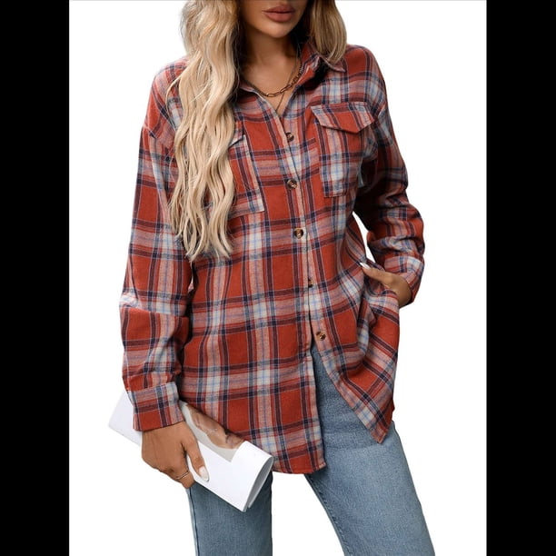 Camisa Abotonada para Mujer, Camisa A Cuadros, Larga, Solapa, Informal, para Negocios, Trabajo Rojo XXL