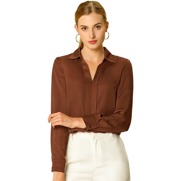 Camisa de trabajo Unique Bargains de manga larga elegante con cuello En V para mujer Marrón L