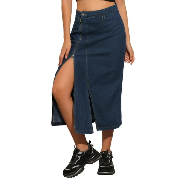 Falda de mezclilla larga con cremallera frontal y abertura para mujer INSPIRE CHIC, con bolsillos, tamaño XL, azul profundo
