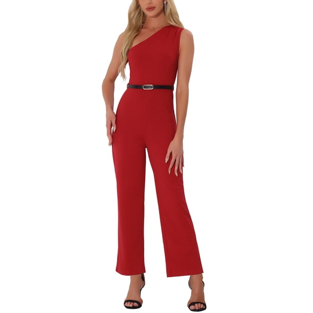 INSPIRAR CHIC Mono Hombro Overoles para Mujeres Vestido Sin Mangas Cinturón Pierna Ancha Mono Rojo L