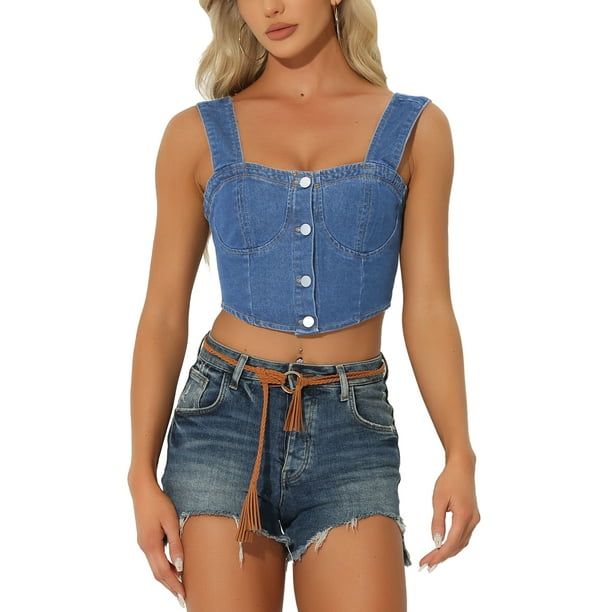 Inspire Chic Tops de mezclilla con corset para mujer, blusa sin mangas, bustier, top corto de jean, color azul