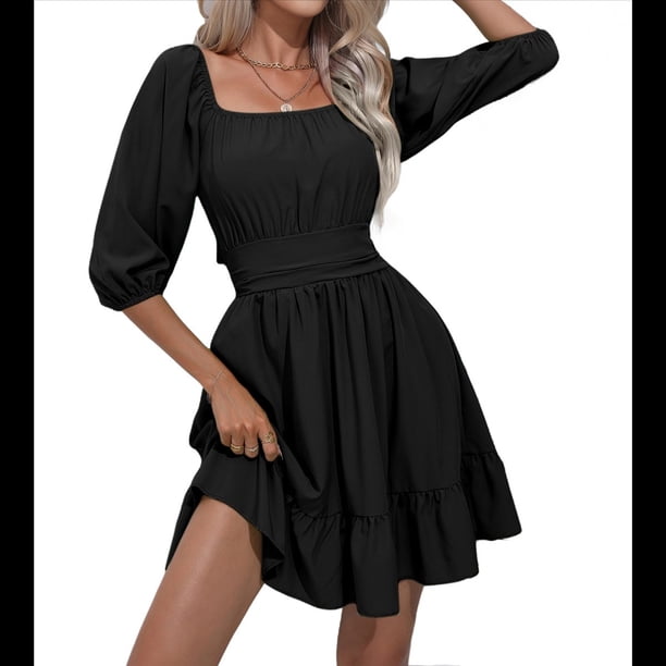 Vestido Informal de para Mujer, con Mangas Largas Tipo Farol, Cintura Alta y Lazo en la Espalda, Corte A. Negro M