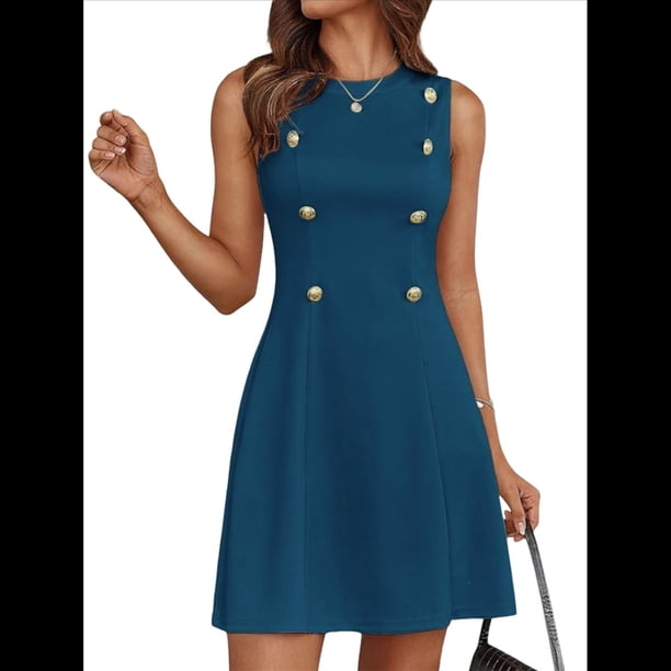 Vestido Mini Formal de Verano para Mujer, Informal, Sin Mangas, Elegante, con Botones, Ideal para Oficina Azul Pavo Real M