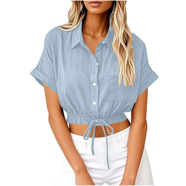 Vestidos Casuales Para Mujer, Blusas De Mujer De Moda Blusa corta de lino con solapa y botones sueltos para mujer, ropa de trabajo de verano