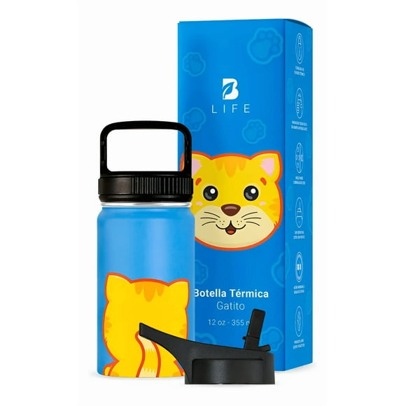 Botella de Agua para Niños 355ml Gatito | Con Asa, 2 Tapas, 2 Popotes y Cepillo | Libre de BPA | B LifeBotella De Agua Plegable De 700ml, Botella De Agua Segura Para Niños De Boca Ancha De Silicona De Alimentaria Con Mosquetón Para Deportes De Viaje